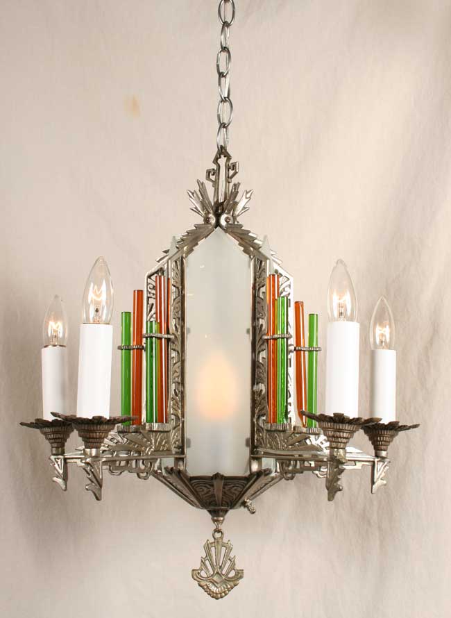 Stunning 6 light Art Deco Chandelier. Dark nickel finish over brass. Would look great in a dining room area. Circa 1930. 28″H x 20″ W. Six Edison base 40 watt bulbs required.