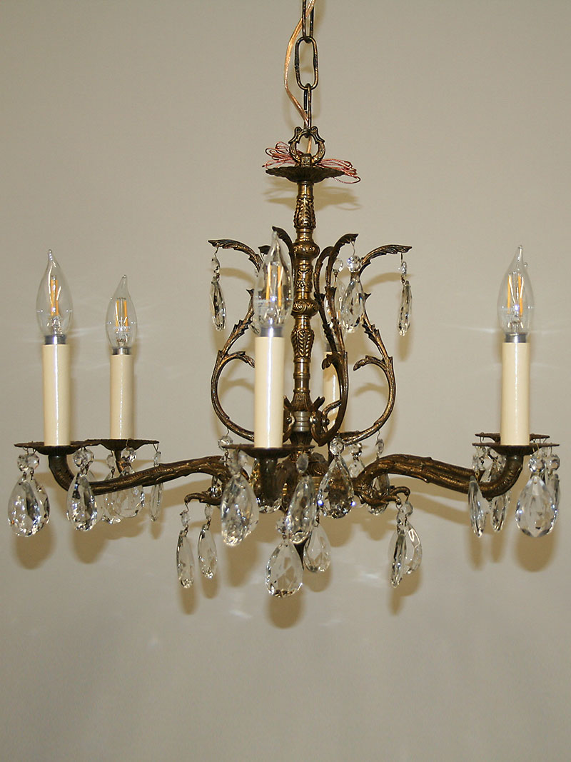 Lovely Six Light Brass and Crystal Chandelier has a Scroll Caged Column. Circa 1950. 22″ H min x 21″ W, Six candelabra base 60 watt bulbs recommended. Chandelier would be great in a Dining Room.