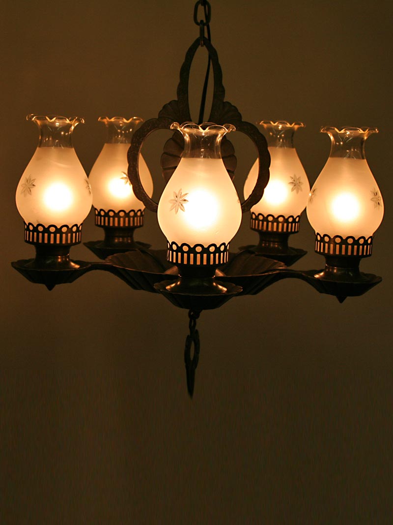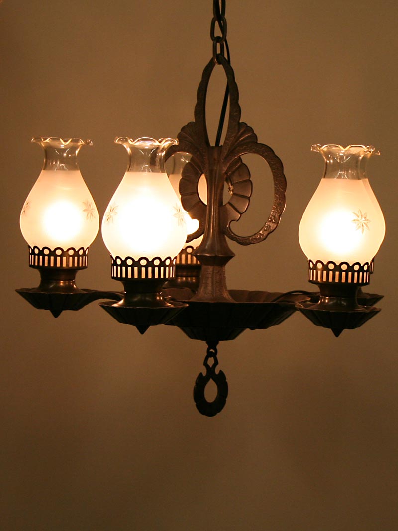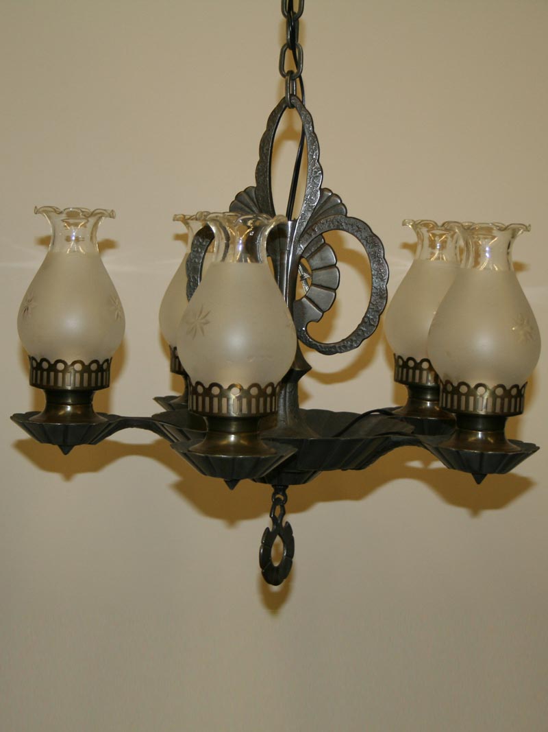 Arts and Crafts five light iron fixture with original glass chimneys. Circa 1920. 24″ H x 18″ W x 18″ D, Five Edison base 60 watt bulbs recommended.