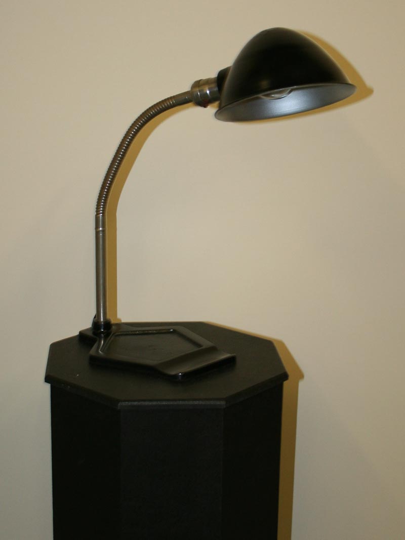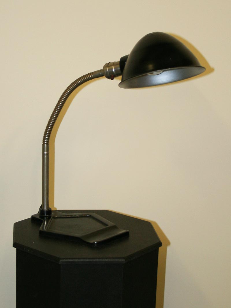 Steel Tone Goose Neck Desk Lamp with Black Painted Pentagon Base & Hood. Base only. Circa 1930. 20″ H x 7″ W x 14″ D, One Edison base 60 watt bulb recommended. Lamp would work well on a desk.