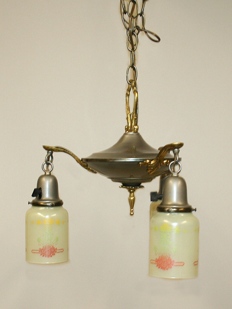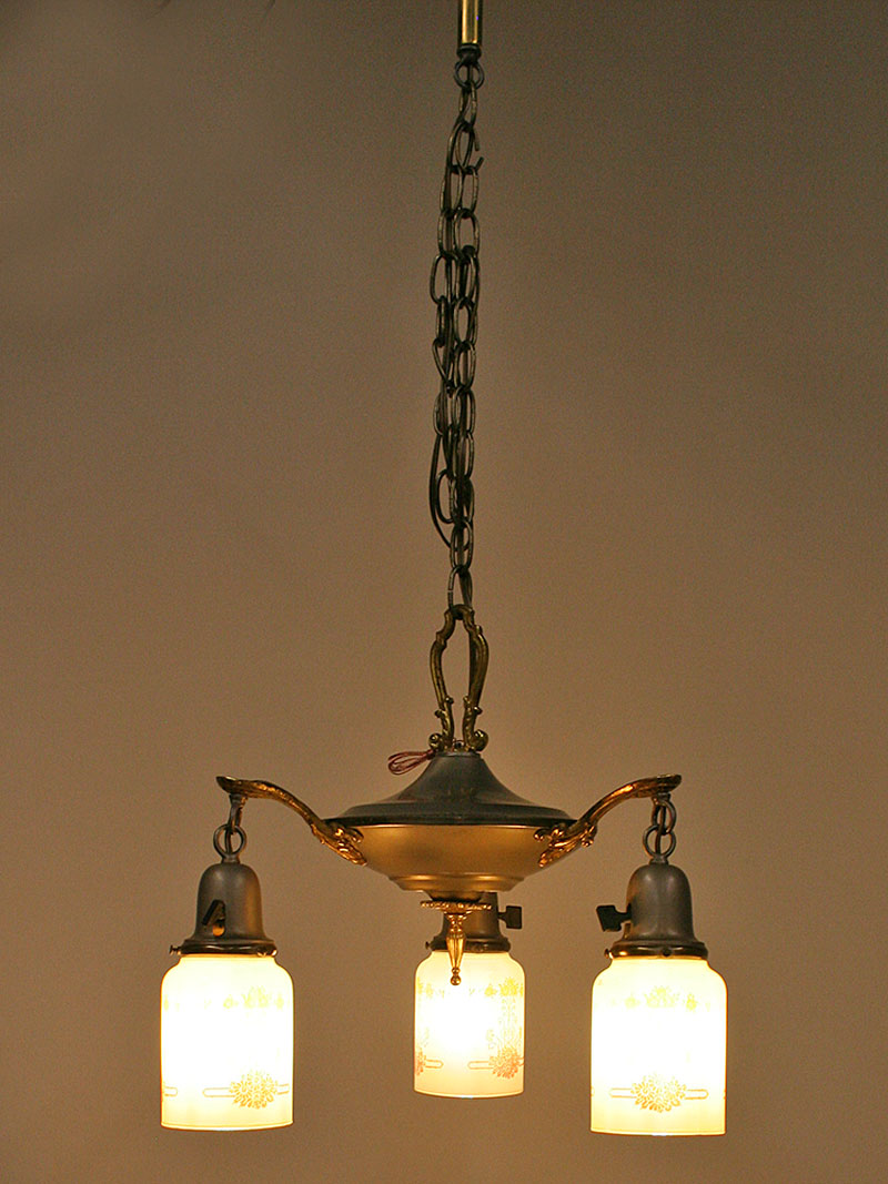 Classical Revival Three Light Pan Fixture has the Original Pewter Finish and Brass Accents. Included are the Original Frosted Glass Shades. Shades are Decorated with Multicolor Floral Appliques. Circa 1920. 24″ H x 14″ H, Three Edison base 60 watt bulbs are recommended. Light is nice over a Table.