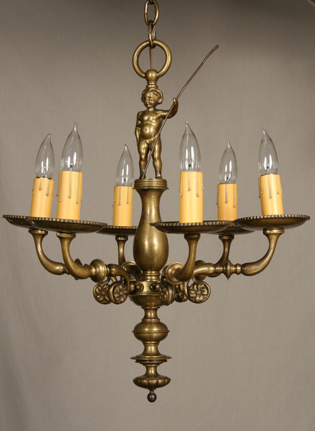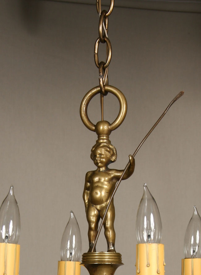 A simple compact vintage chandelier with a cherub figure on the top of the column. This chandelier has a brass finish and is Circa 1940. Bobeche cups have beadwork around the rims. Perfect for a smaller space. 28″ H x 19″ W. Six Edison base 60 watt bulbs required.