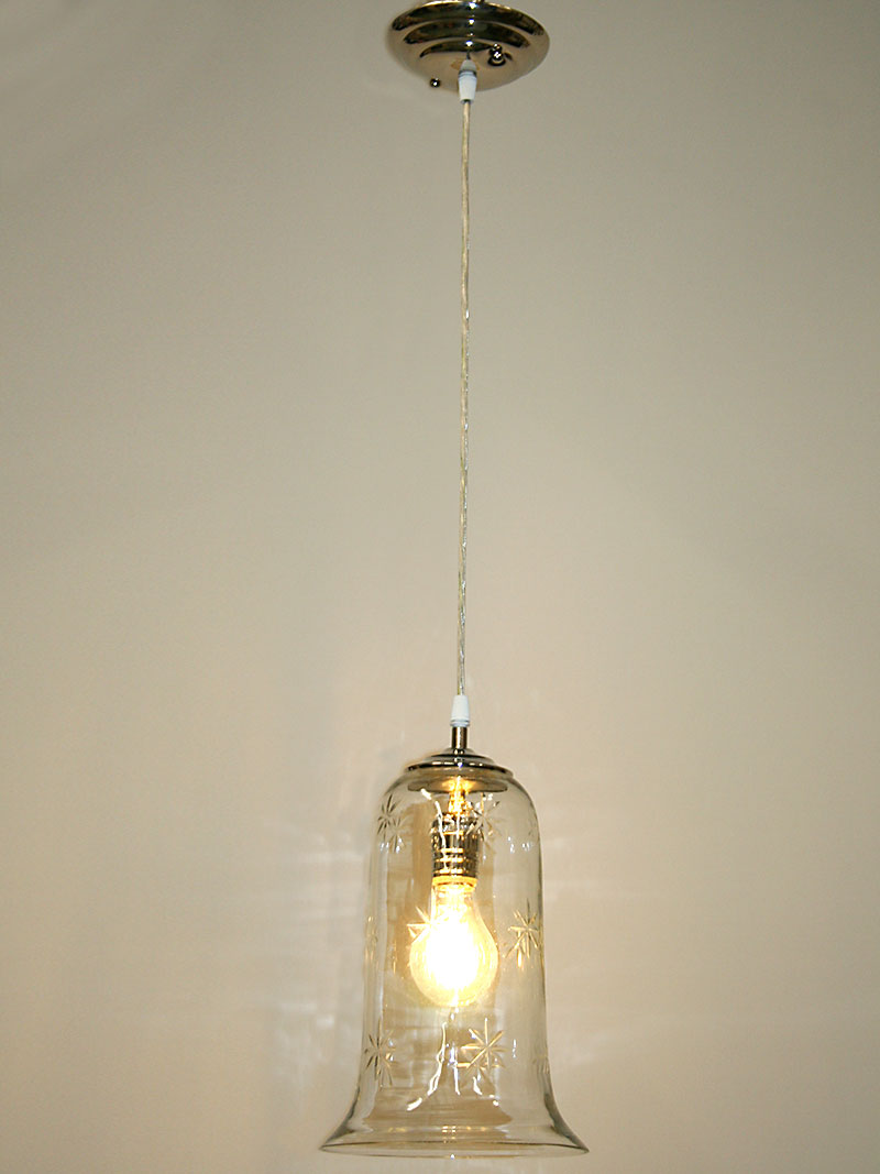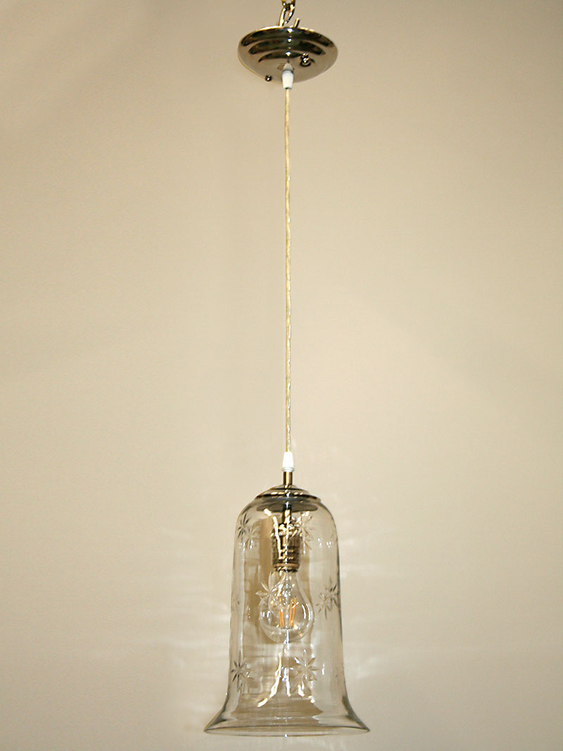 Custom Built Bell Shaped Glass Pendent has a Hand-Cut Starburst Design and Nickel Hardware. Base only. 15″ H(min) x 8″ W, One Edison base 60 watt bulb recommended. Pendant is perfect for over a Sink or Breakfast nook.
