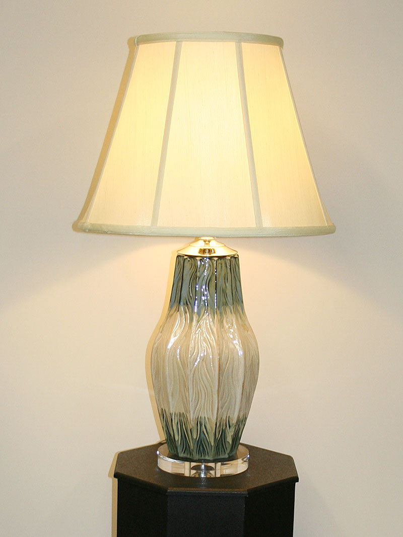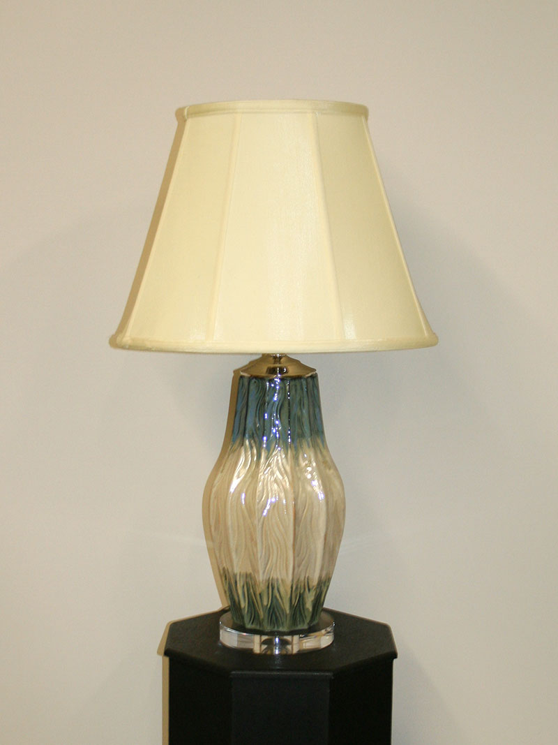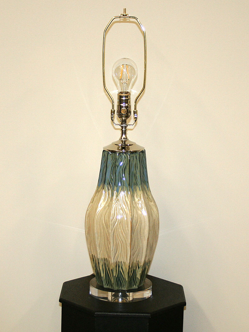 Custom-Built Rustic Ceramic Vase Lamp w/ Blue/Gray & Taupe Colors has Nickel Hardware and a Clear Acrylic Base. Base only. 19 1/2″ H x 7″ W, One Edison base 3-way bulb required. Lamp is perfect for a Living Room or Family Room.