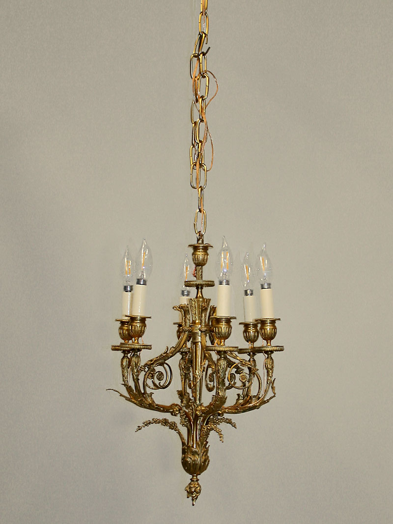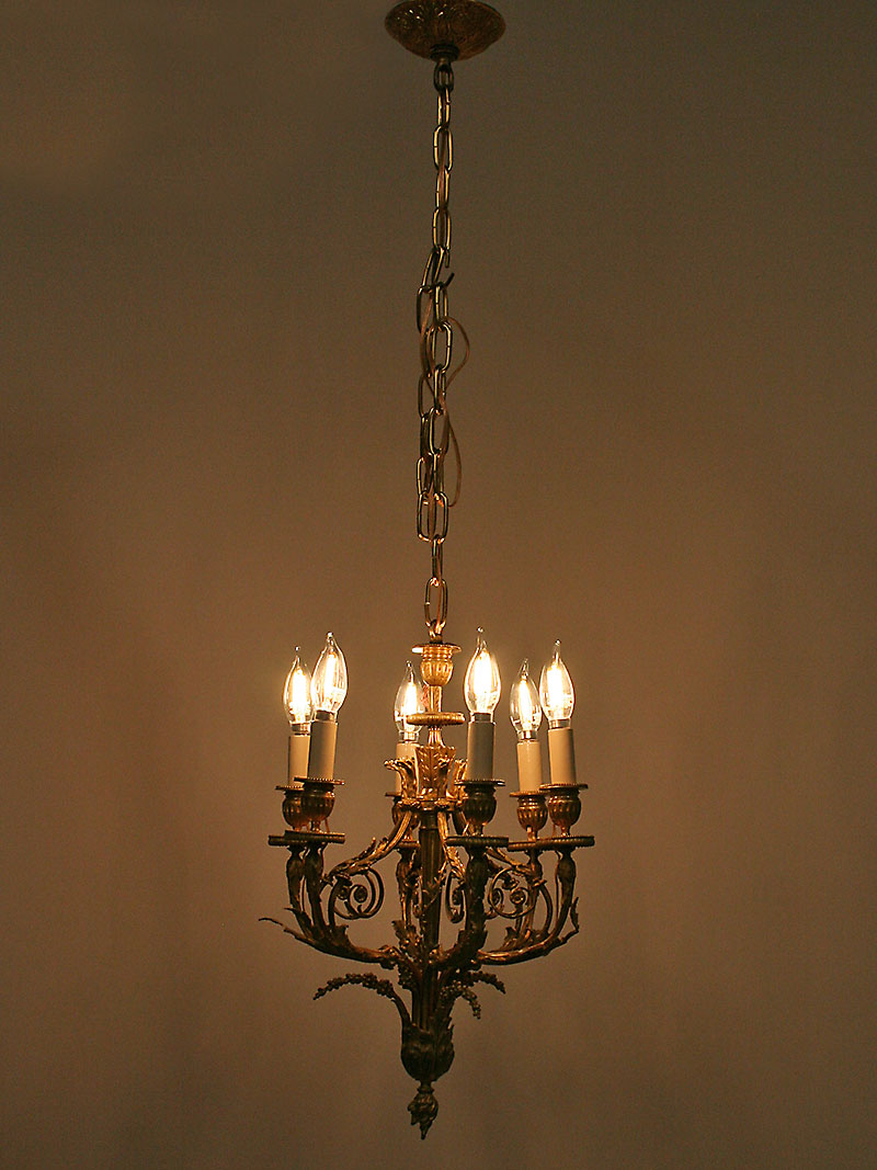 Elegant French Gilt Gold Six-Arm Neoclassical Chandelier with Organic Design. Circa 1920. 20″ H x 12″ W, Six candelabra base 60-watt bulbs recommended. Petite chandelier provides excellent light for an Entry, Walk-in Closet, or Stairway.