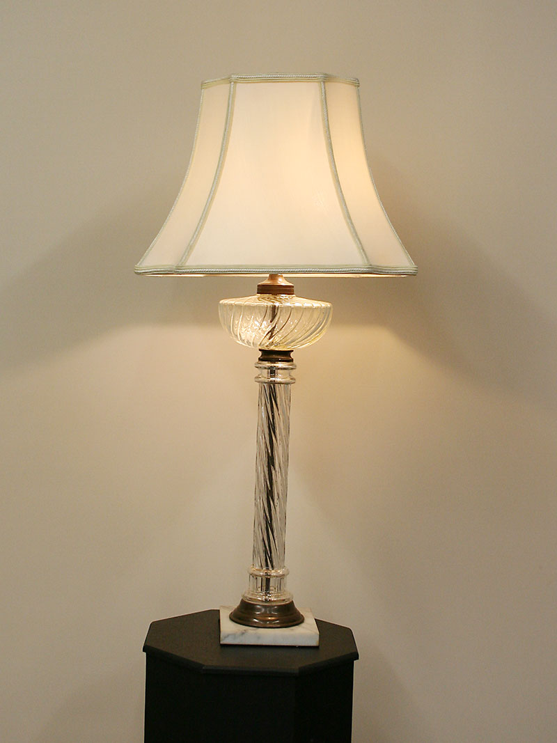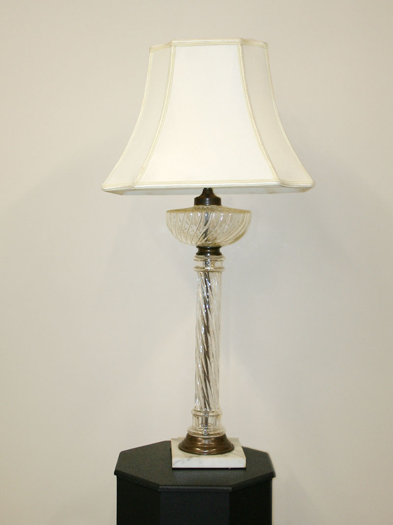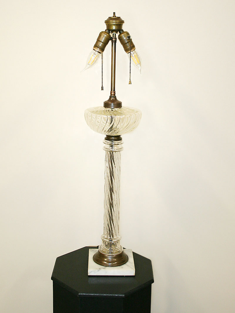 Tall Vintage Swirl Glass Table Lamp is Elegant in Design and has a Square Marble Base. Base only. Circa 1930. 31″ H x 7″ W, Two Edison base 60-watt bulbs recommended. Lamp would be nice in a Dining Room or Hallway.