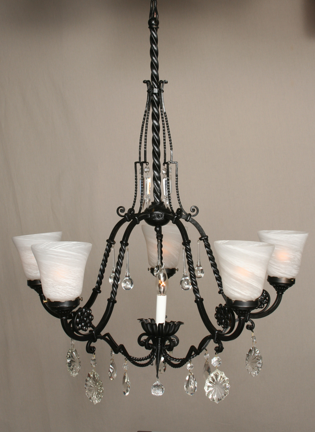 A unique vintage chandelier with six-lights. This chandelier is beautifully finished in black and is accentuated with crystals. White swirl glass shade. French style. Circa 1960. 36″H X 27″W. Six candelabra base 60 watt bulb required.