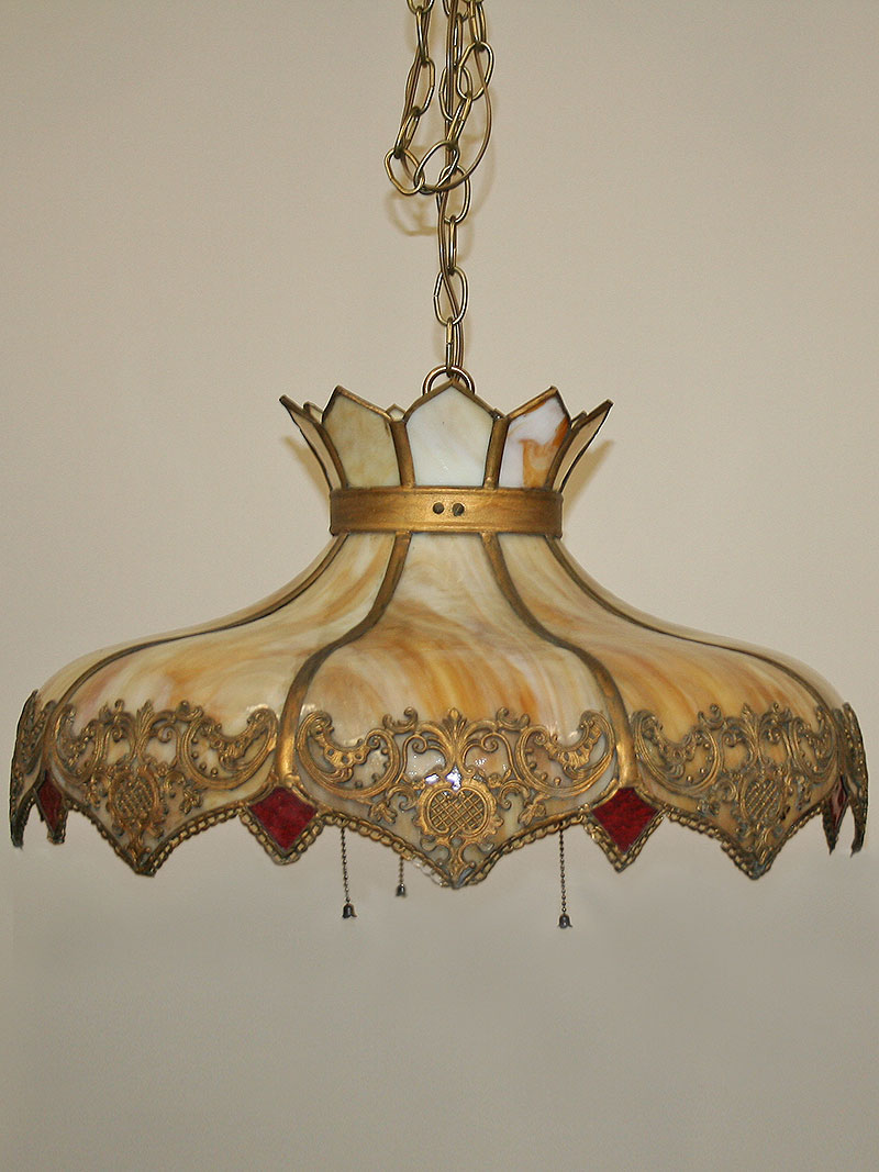 Slag Caramel Glass Pendant with Great Filigree Frame and Ruby Red Accents. Circa 1900’s. 13″ H x 22″ W, Three Edison base 60 watt bulbs recommended. Pendant would be great over a Table.