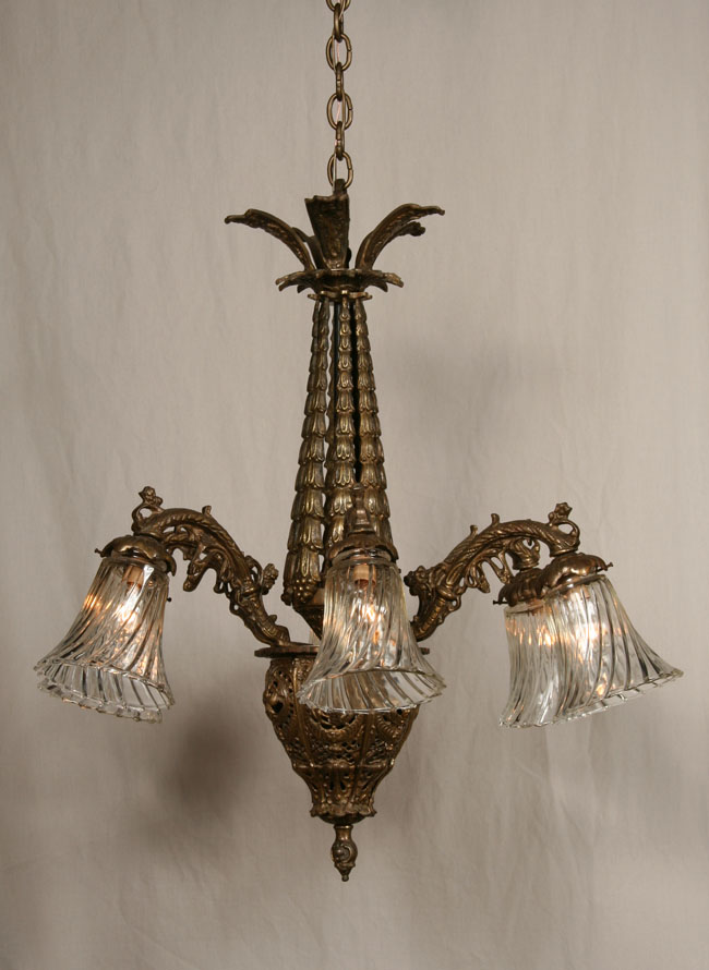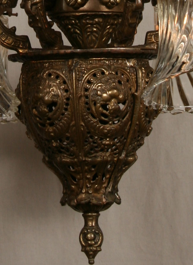 Exquisite chandelier for a grand entryway or above a classical dining room table. Circa 1940. Intricately cast brass with cascading flowers down center column. Clear swirled glass shades. Dark antique brass finish. 28″ H x 28″ D. 6 candelabra base 60 watt bulbs required.