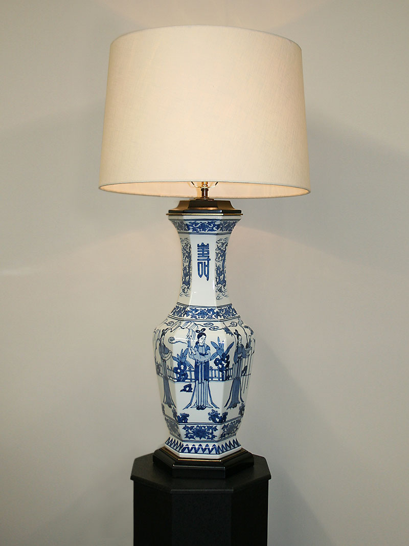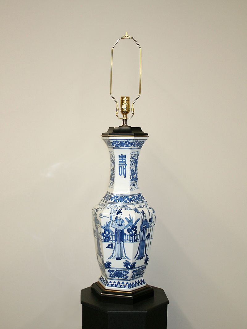 Large Oriental Blue & White Hexagon Shaped Vase Table Lamp with Wooden Base. Imagery on Vase Depicts a Woman’s Story. Base only. Circa Late 20th Century. 28″ H x 9″ W, One Edison base 3-way bulb required. Lamp is perfect for a Living Room, Office, or Library.