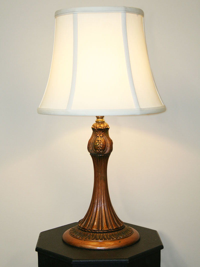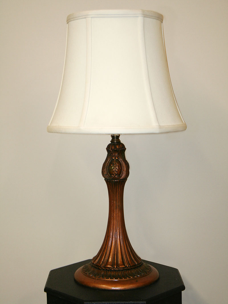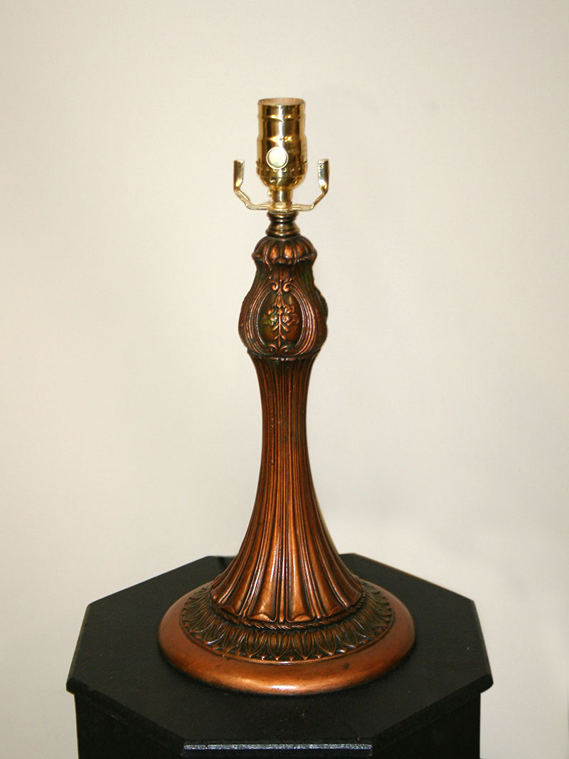 Lovely Victorian Green and Copper Botanical Motif Table Lamp has the Original Polychrome Finish. Base only. Circa 1900’s. 16″ H x 7-3/4″ W, One Edison base 3-way bulb required. This lamp base is perfect for a Leaded Glass or Slag Glass Shade and can be used in an Office, Living Room, or Library.