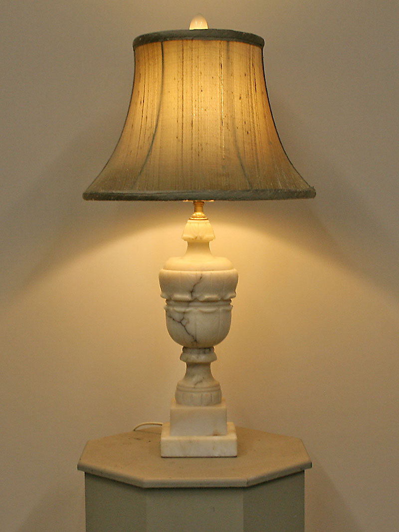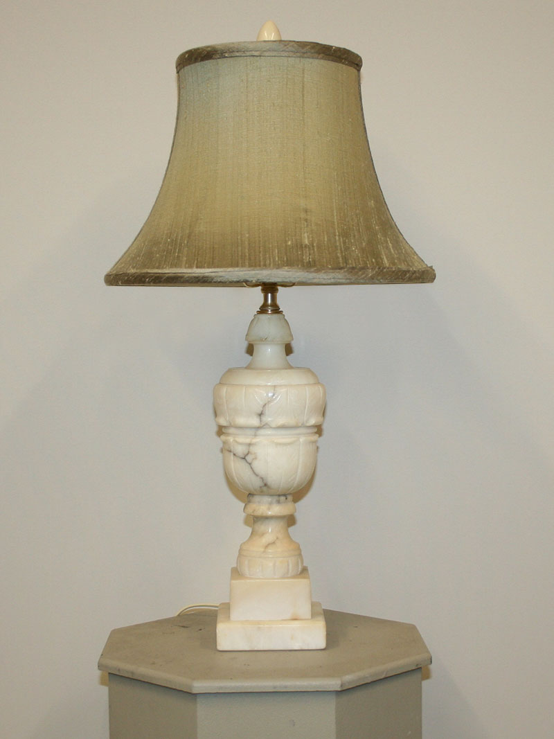 Vintage Neoclassical Hand-Carved Alabaster Table Lamp. Made in Italy. Base only. Circa 1950. 17″ H x 4 1/2″ W, One Edison base 3-way bulb required. Lamp is perfect for a small table.