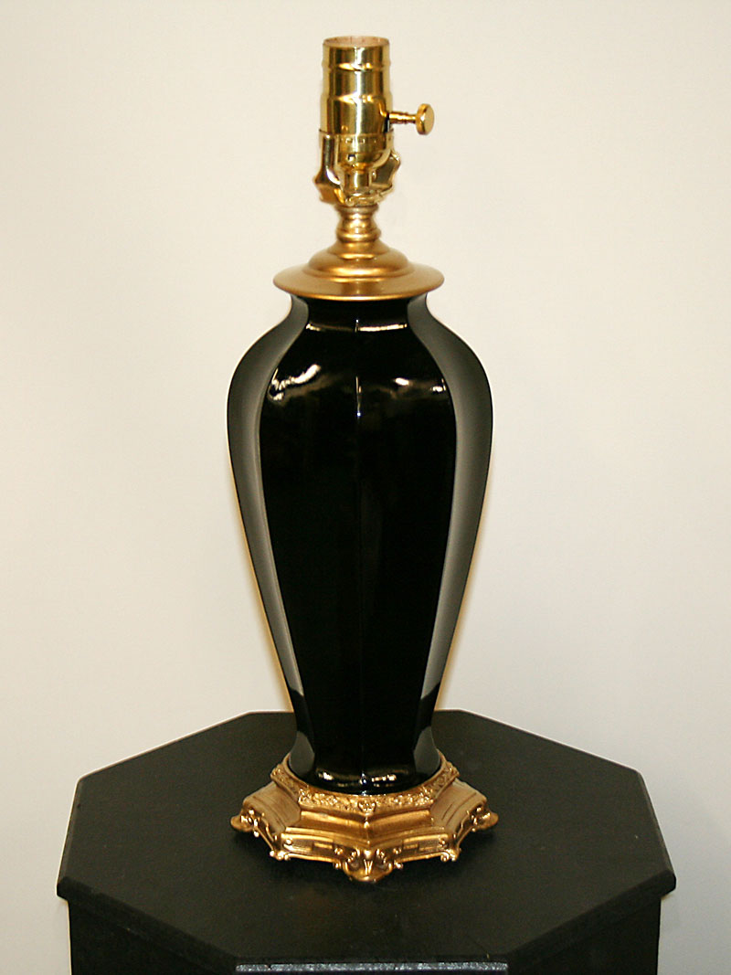 Vintage Neoclassical Style Black Amethyst Glass Lamp marked “Artistic Brass & Bronze Works Inc.” Base only. Circa 1930. 16 1/2″ H x 5 1/2″ W, One Edison base 3-way bulb required. Lamp is perfect for a Living Room.