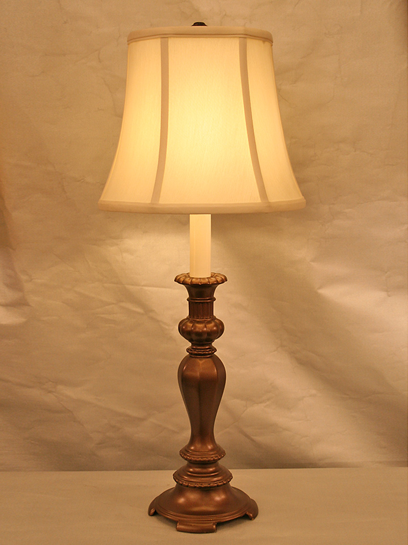 Painted Antique Copper Candle Stick Table Lamp with Footed Base. Base only. 22″ H x 7 1/2″ W, One Edison base 3-way bulb required. Lamp could be used on a bedside table.