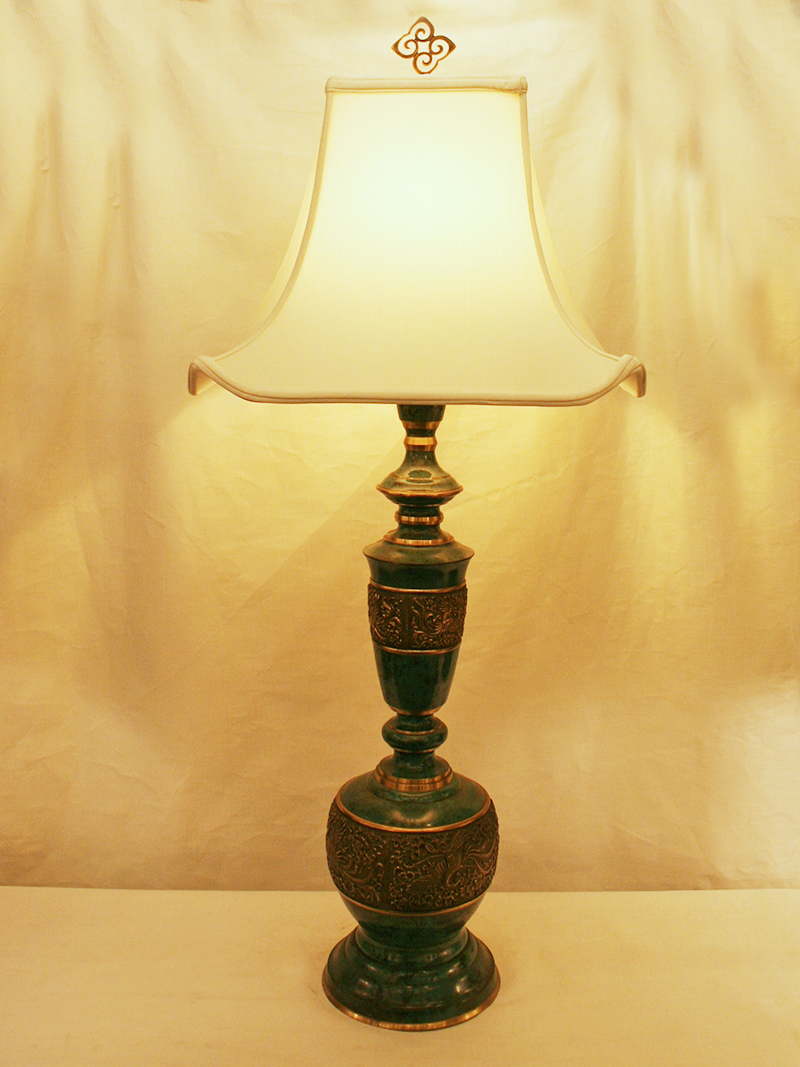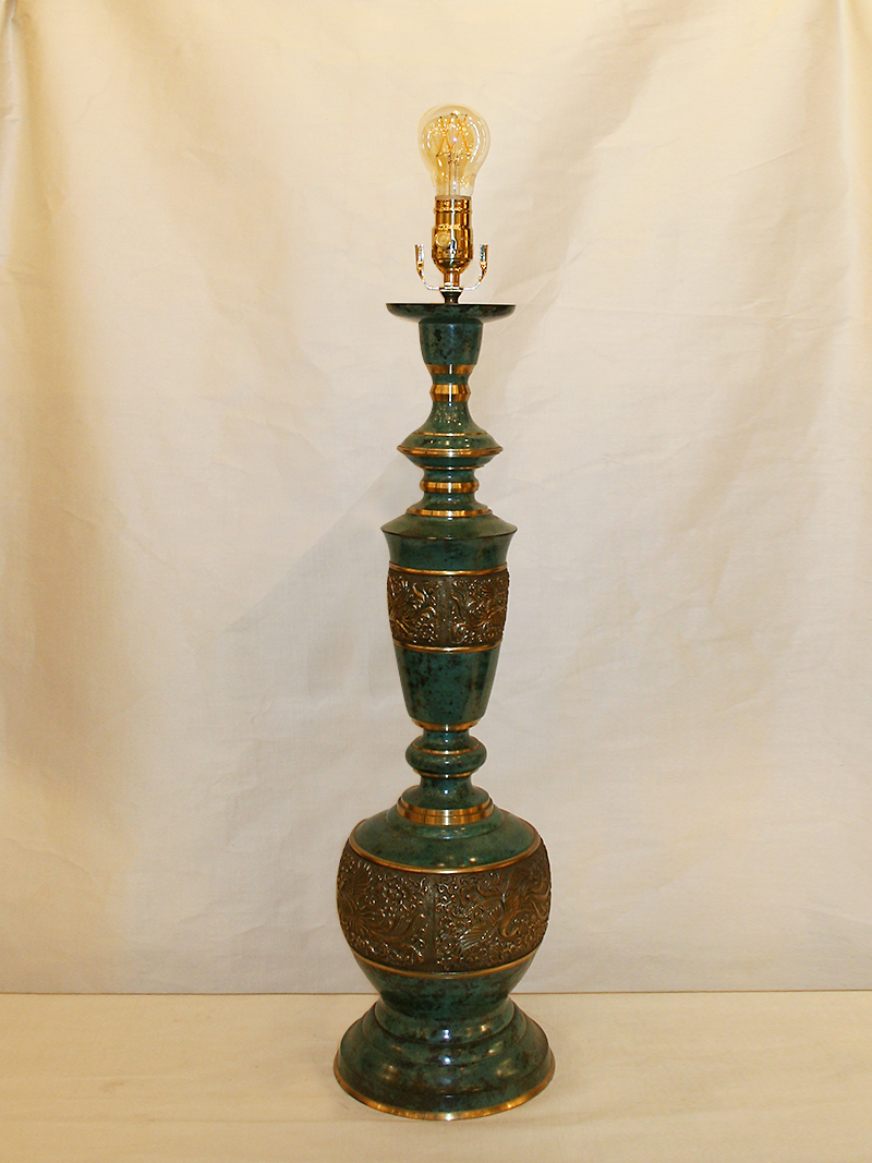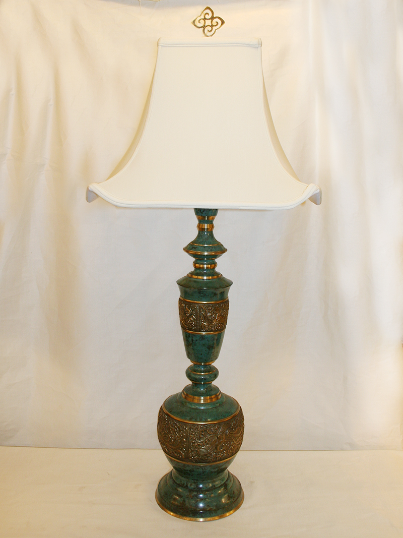 Tall Brass Lamp has a Decorative Phoenix Scene and a Verde Finish. Base only. Circa 1950. 30″ H x 7 1/2″ W, One Edison base 3-way bulb required. Lamp would be great in a Office, Living Room, or Library.