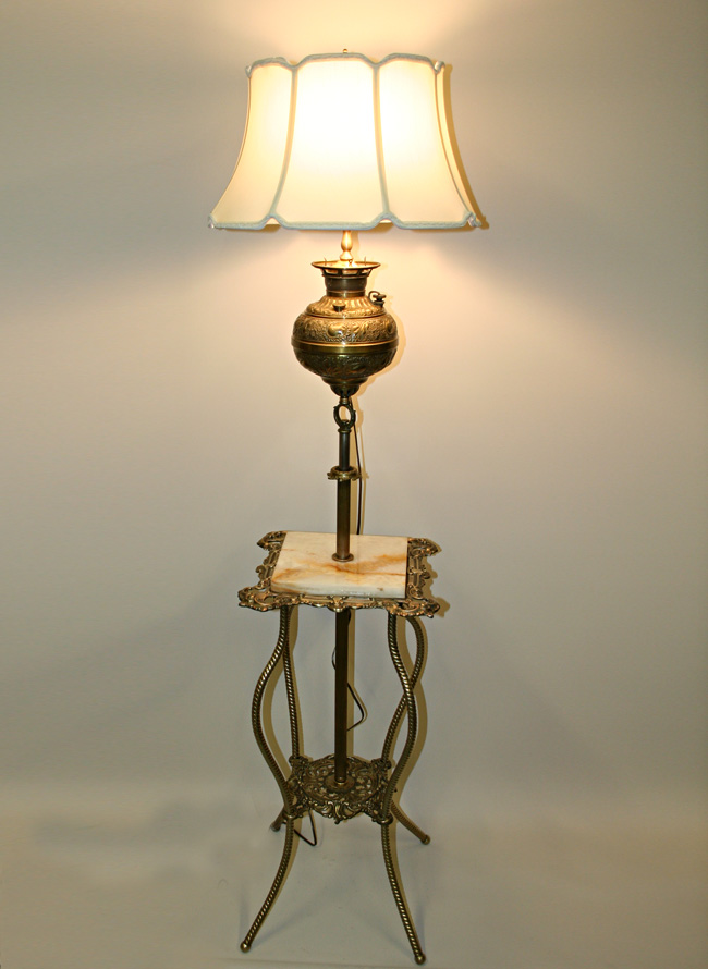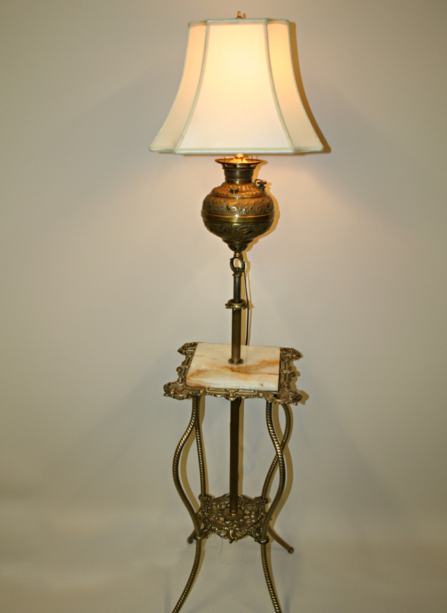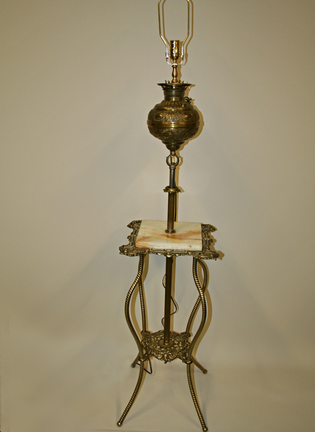 Brass Oil Conversion Victorian Floor Lamp w/ Marble Table. Height of lamp is adjustable using the push button clutch. Base Only. Circa 19th Century. 57″ H x 14″ W x 14″ D, One Edison base 3-way bulb required.
