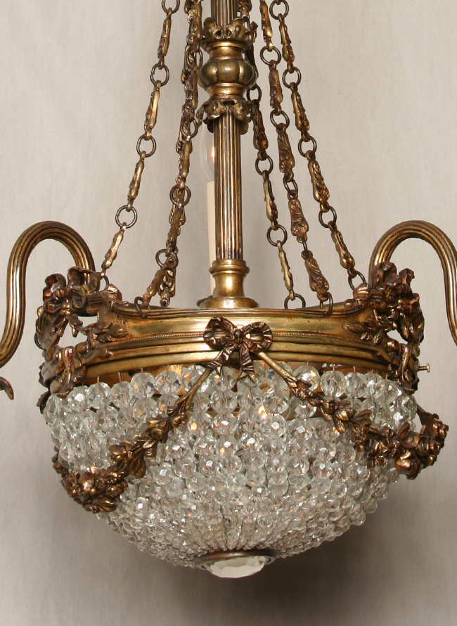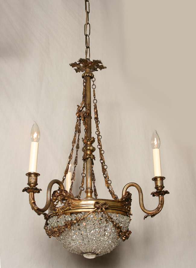 A vintage four-light graduated crystal beaded basket chandelier. This Circa 1945 piece is European style and has cast floral garland and chain accents. Stuning antique brass finish. 34″ H x 18″ W. Four candelabra base 60 watt bulbs required. This piece has been carefully restored to its original beauty with new electrical components by the skilled craftsmen at Restoration Lighting Gallery.