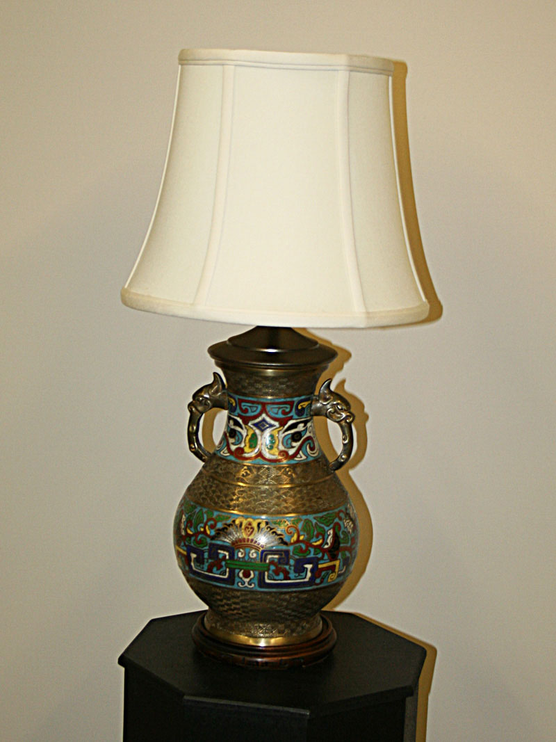 Champleve vase with geometric etching and archaic imagry featuring dragon handles and a wooden base. Base Only. Circa 19th Century. 19″ H x 8″ W x 8″D, One Edison base 3-way bulb recommended. Perfect in an office.