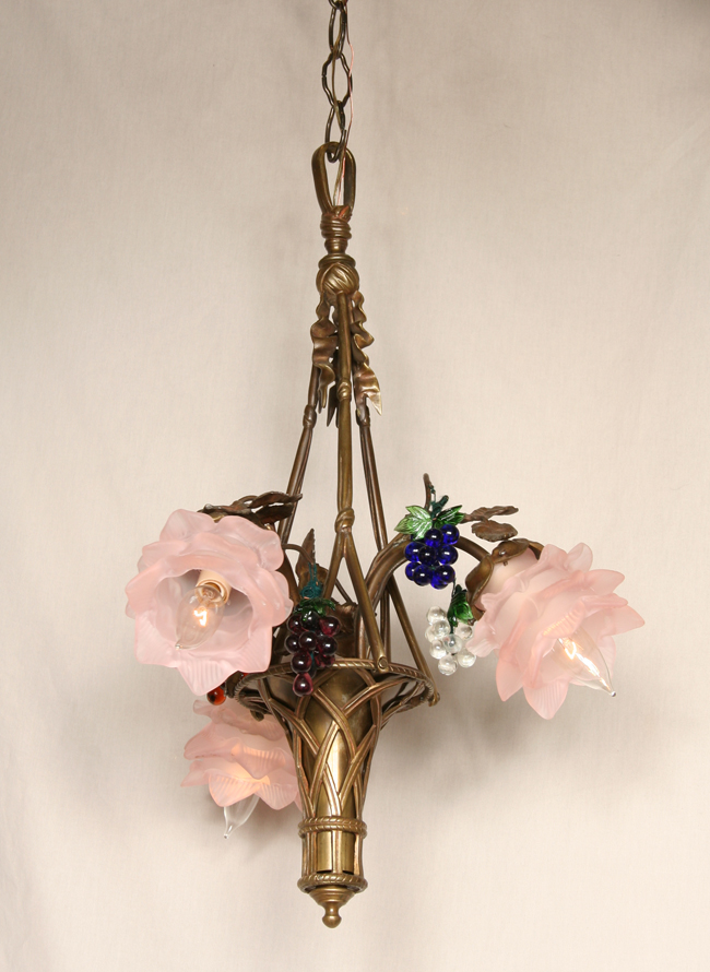 This three-light basket style chandelier has beautiful pink flower design glass shades and various grape accents to create a whimsical look. Antique brass finish. Circa 1940. 30″ H x 19″ W. Three candelabra 60 watt base bulbs required.
