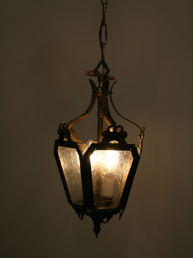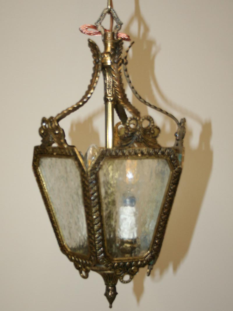Vintage French Brass Lantern is Ornately Decorated and has Rain Glass. Circa 1960. Base only. 20″ H x 8 1/2″ W, Two candelabra base 40 watt bulbs recommended. Lantern works nicely in a small Entry or Hallway.