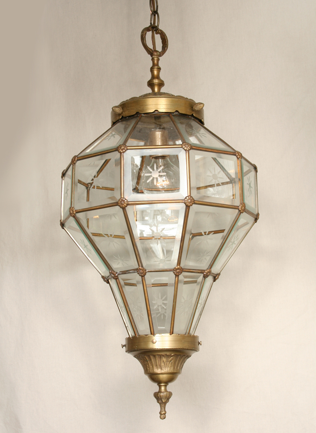 A large bond glass lantern with starburst designs. Circa 1945. Antique brass finish. European style. 36″ H X 15″ W X 15″ D. One Edison base 100 watt bulb required.