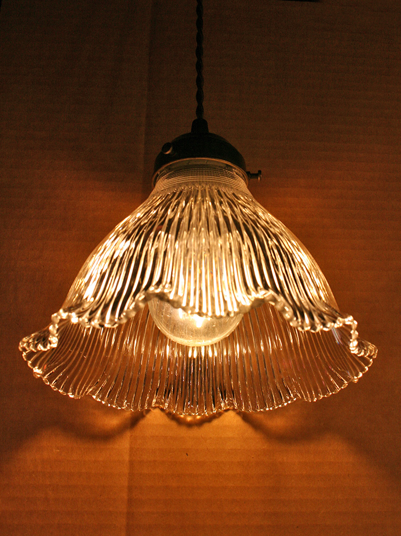 Vintage Holophane Ruffled Glass Pendant has New Antique Brass Hardware and Twisted Brown Rayon Cord. Circa 1930. 12″ Min(48″) H x 8″ W or 6″ W, One Edison base 100 watt bulb recommended. Pendant could be used over a Sink or Island.
