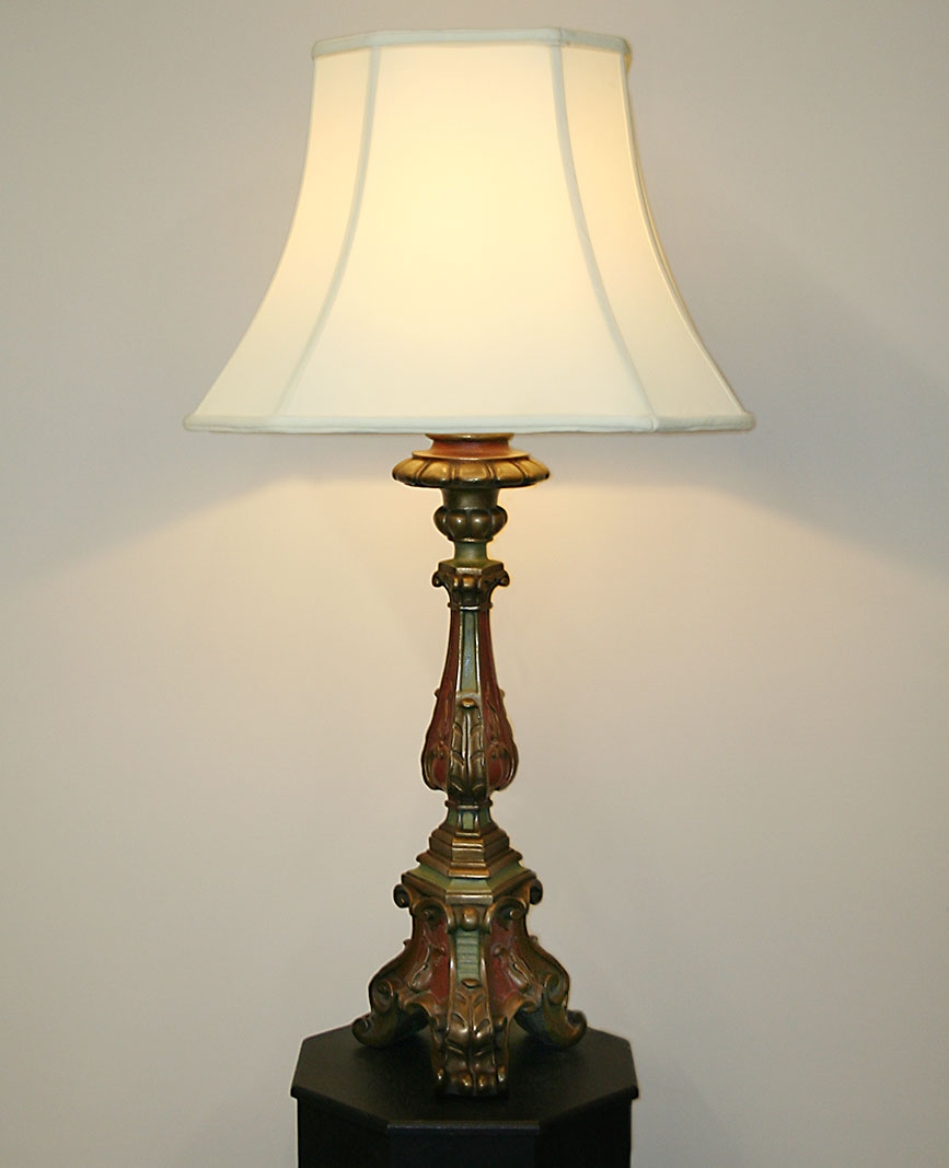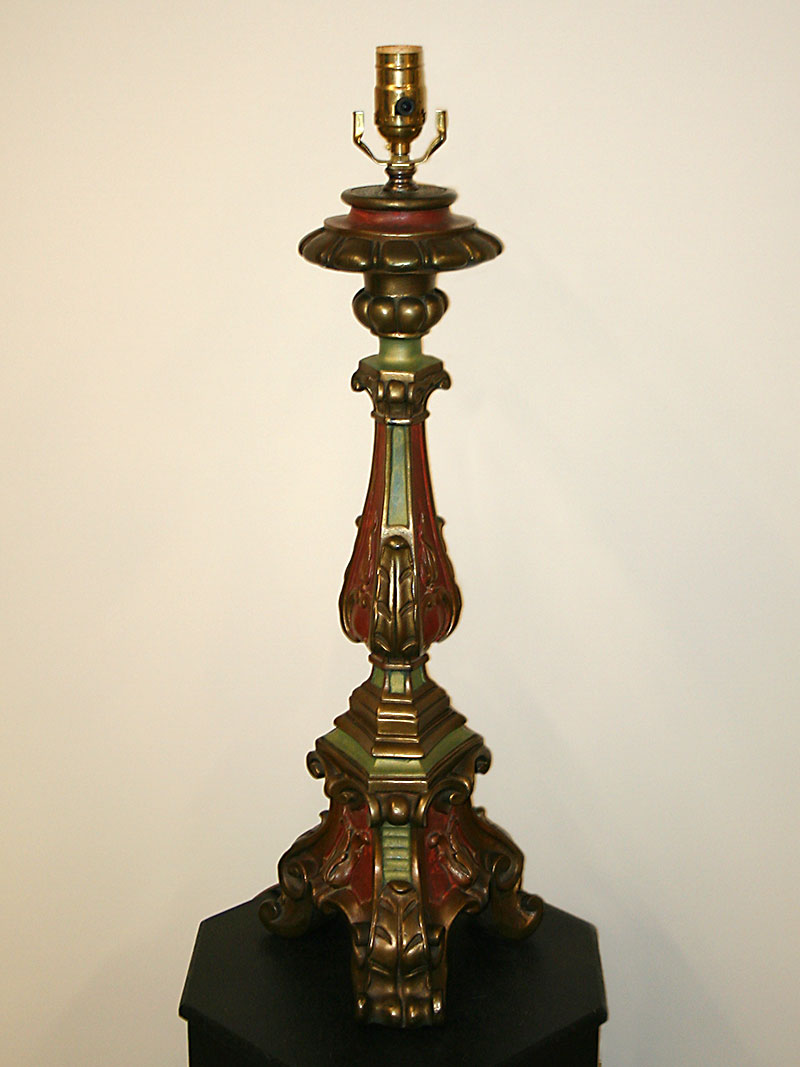 Vintage Painted Italian Table Lamp has Ornate Carved Details and All Original Finish. Base only. Circa Early 20th Century. 26-1/2″ H x 9-1/2″ W, One Edison base 3-way bulb required. Lamp is perfect for your Living Room or Office.
