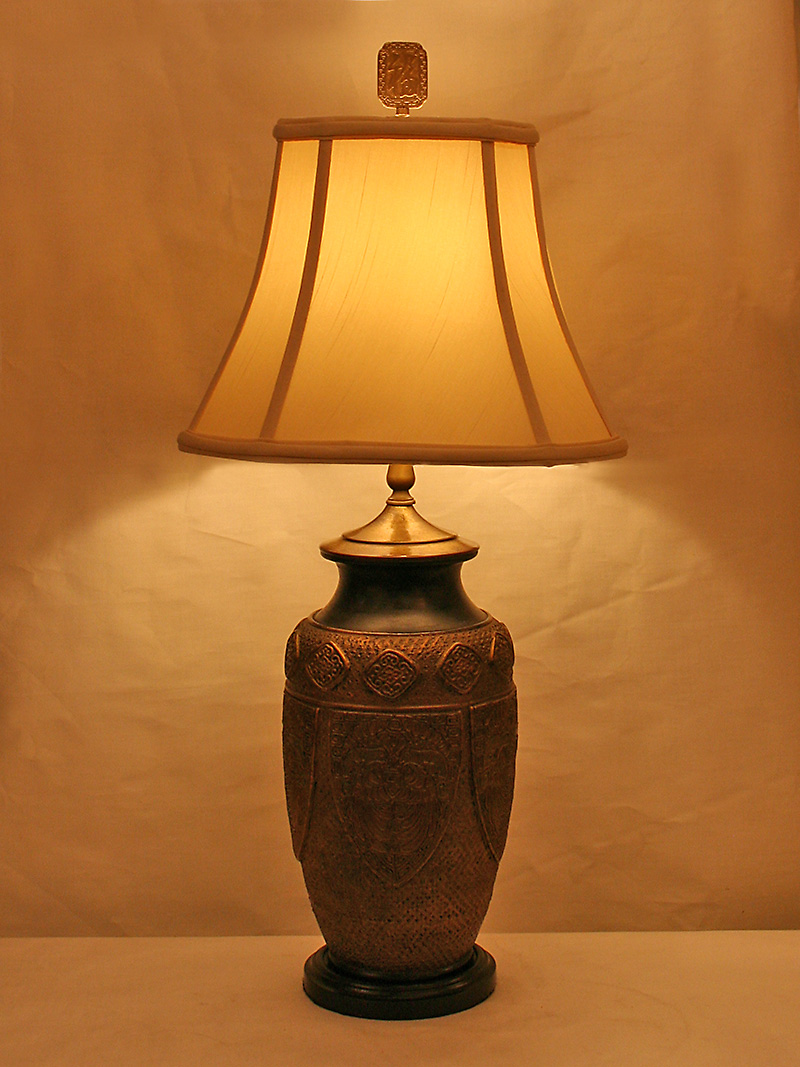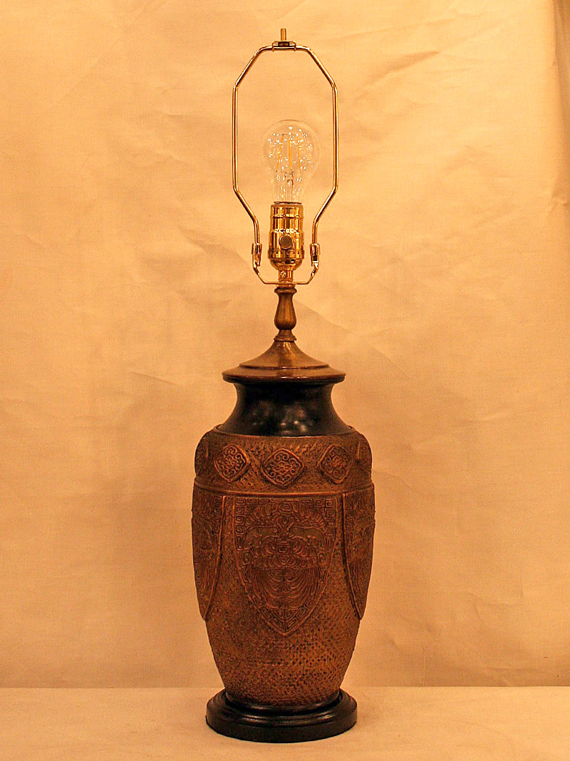 Bronze Tone Vintage Pottery Lamp has an Intricate Carved Design. Base only. Circa 1960. 20″ H x 6 1/2″ W, One Edison base 3-way bulb required. Lamp would be nice in a Library or Office.