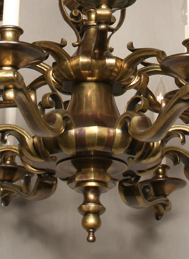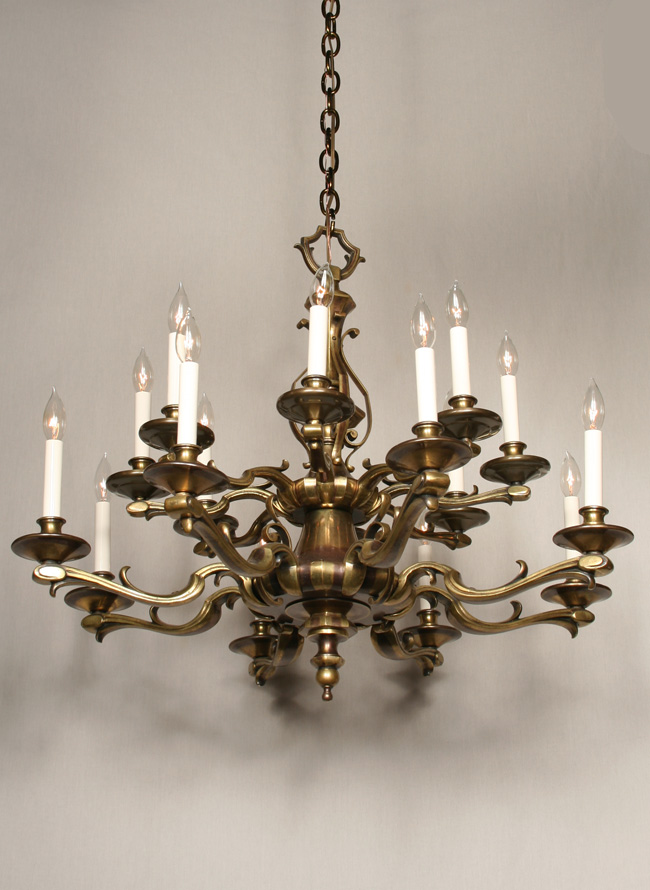A sixteen vintage two-tier flat arm chandelier that has a two toned brass finish. This grand chandelier is Circa 1950 with a European style. 30″ H X 31″ W. Sixteen Candelara base 25 watt bulbs required.
