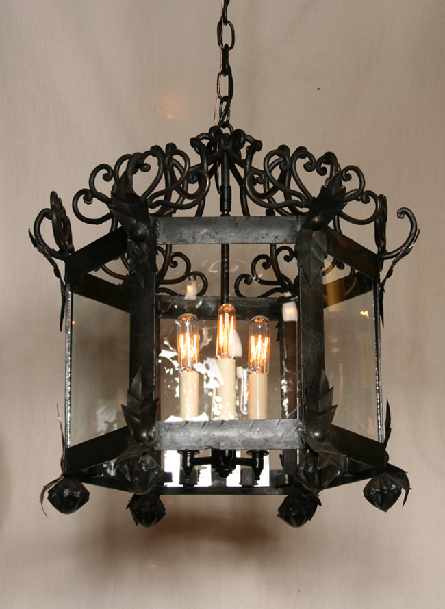 This lantern is made of wrought iron and has great detail. Hex shaped lantern is Circa 1950. Colonial style with a black finish. 19″ H x 19″ W. Three candelabra base 60 watt bulbs required.
